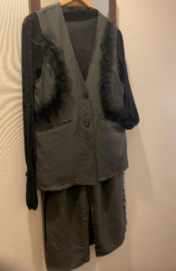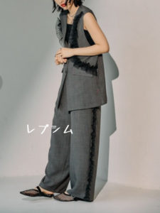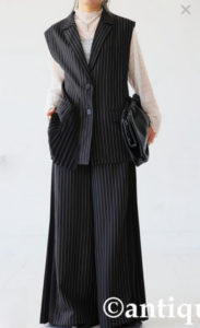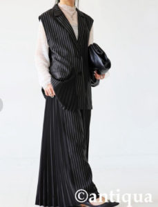 ボーダーで薄手のベストとワイドパンツは、プリーツが上下たっぷり入ってて軽やかでワイルドクール!